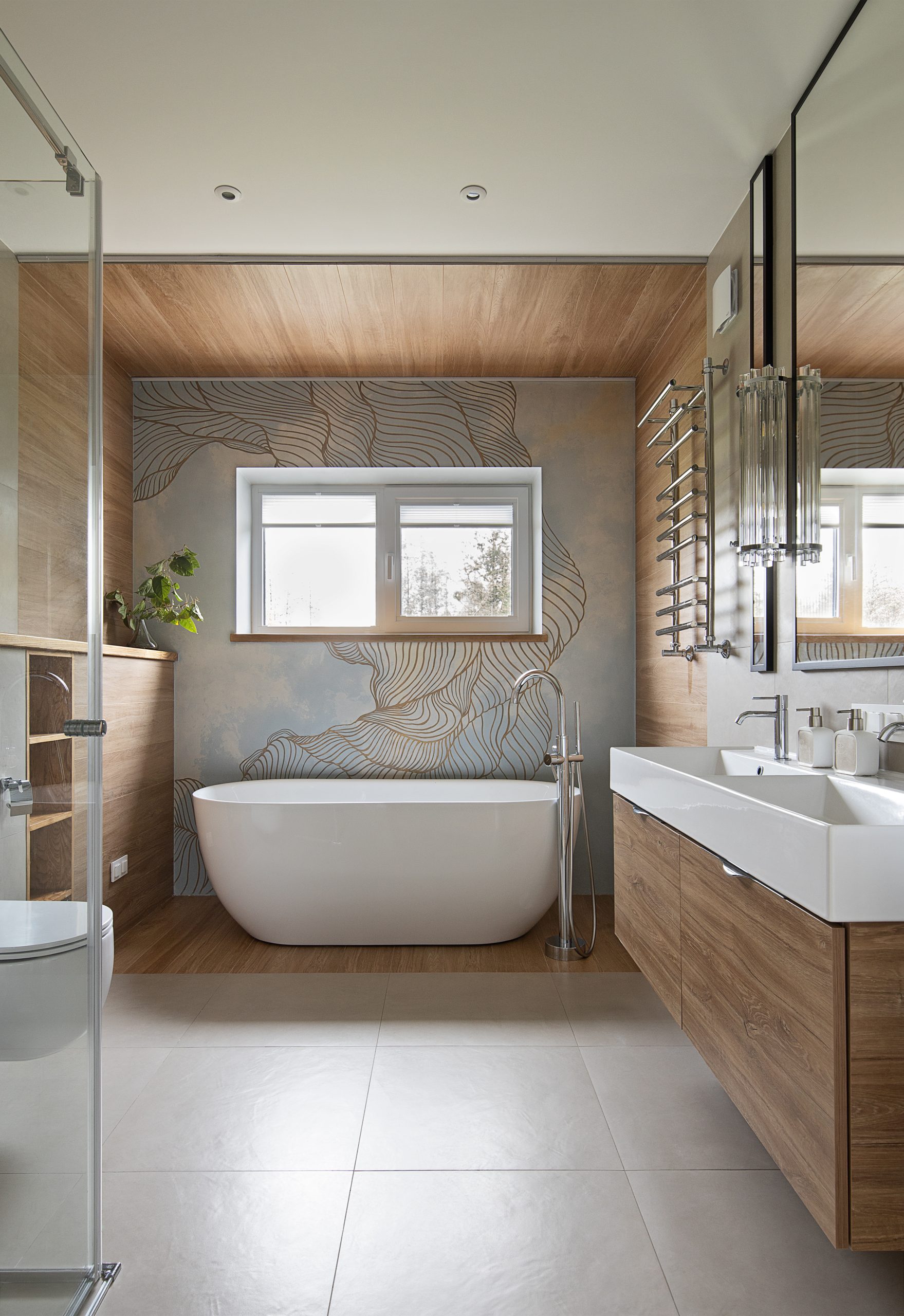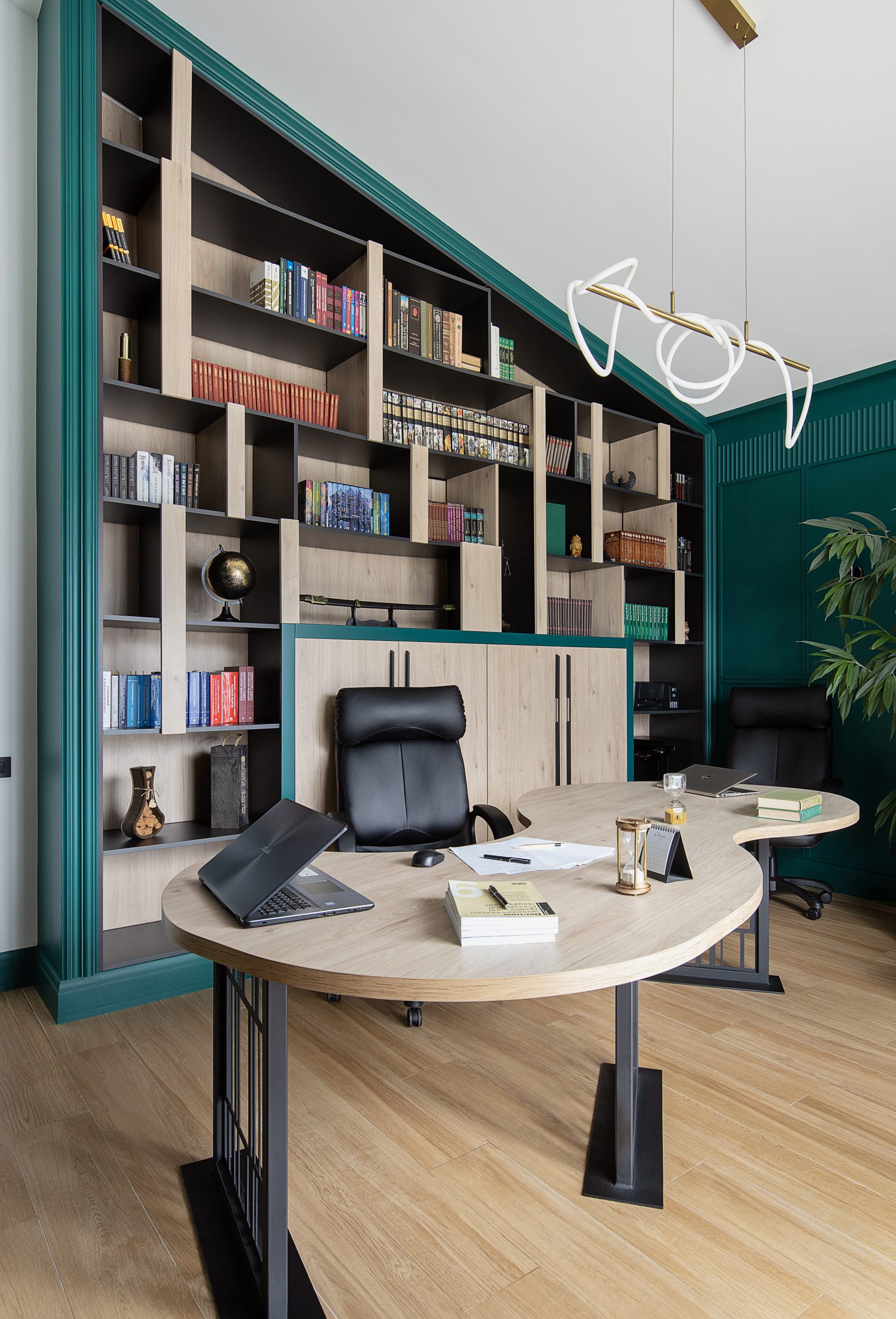 Супруги много работают дома, поэтому им важно было иметь комфортное деловое пространство. Кабинет сделали для двоих. Необычный по форме стол — объединяющий элемент, демонстрирует общность интересов: у хозяев дома одна профессия. Отсюда и потребность во вместительных книжных стеллажах, снизу доверху заполненных художественной и специальной литературой. Чтобы придать современному интерьеру элементы классического стиля, стены выкрасили в глубокий зеленый цвет и декорировали молдингами — имитация буазери. Ненадолго отвлечься от работы, переключить внимание помогают живые растения, наряду с предложенной колористикой они успокаивают и снижают уровень стресса. Ванная комната одинаково успешно решает две задачи: зарядки энергией по утрам (зона душа этому способствует как нельзя лучше) и вечернего релакса — отдельно стоящая ванна выполняет как раз эту миссию. В целом дизайн помещения отражает природную тематику: все материалы, использованные в отделке, имеют текстуры дерева и камня. Хозяева — заядлые ценители бани: сауна — любимое место отдыха супругов и их гостей. Камин в комнате отдыха выполняет важную функцию: с другой стороны это печка для обогрева парной.