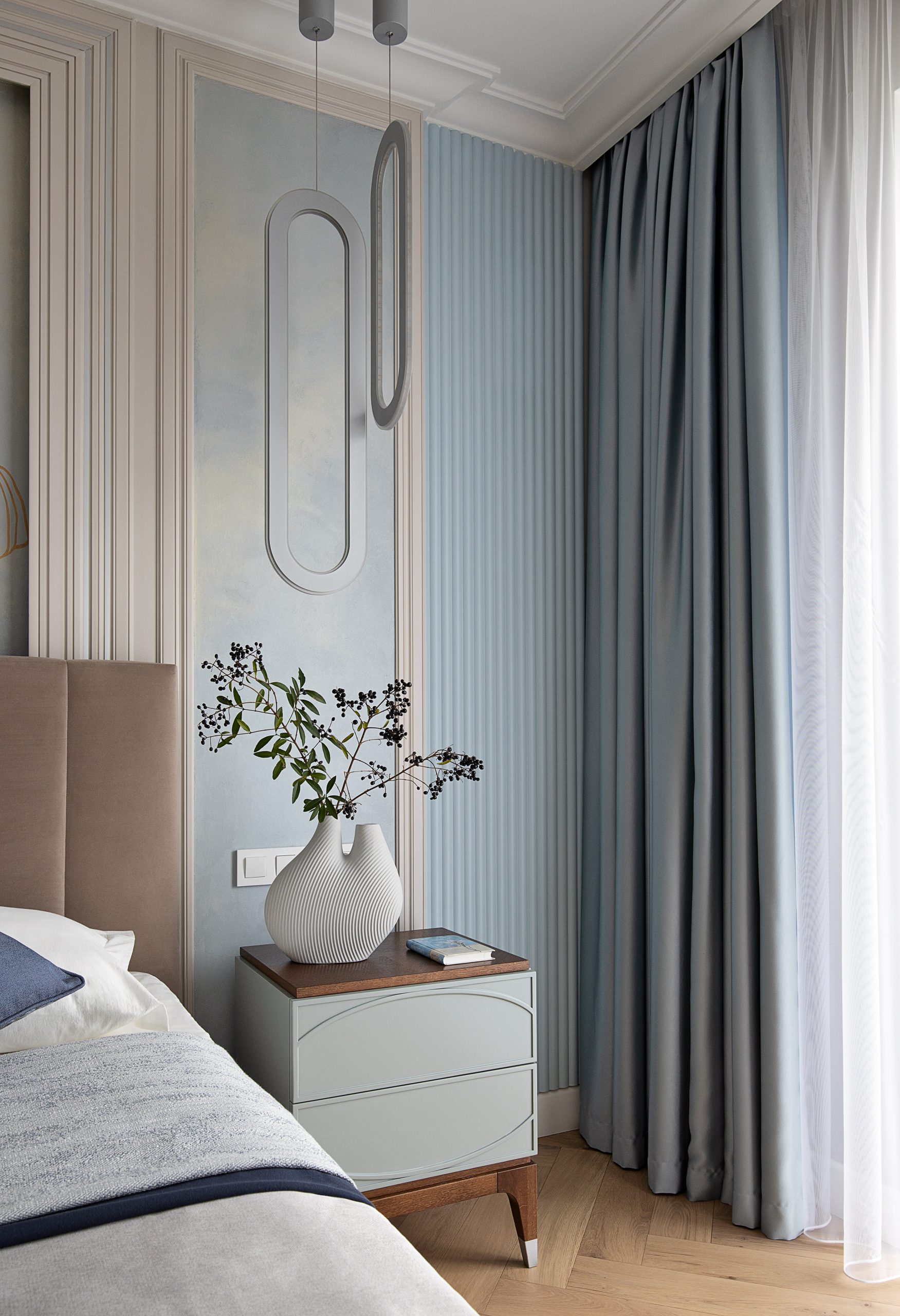 Мастер-спальня — стилистическое продолжение гостиной со смягченной колористикой. Для стен использовали краску и декоративную штукатурку голубого цвета, для штор — ткань того же оттенка, что сделало интерьер по-утреннему свежим. Молдинги окрасили молочным тоном (мы его встречали в гостиной), вкупе с напольным покрытием с текстурой натурального дерева они помогли помещению стать визуально теплее, уютнее. Стену в изголовье кровати украшает роспись (авторская работа художницы Натальи Фоминовой). Золотой узор схож с декором каминного портала. Белоснежный потолок, окна в пол, впускающие в помещение много света, отсутствие массивных систем хранения (их заменяет гардеробная) усиливают ощущение большого объема в и без того немаленькой спальне площадью около 23 кв. м.