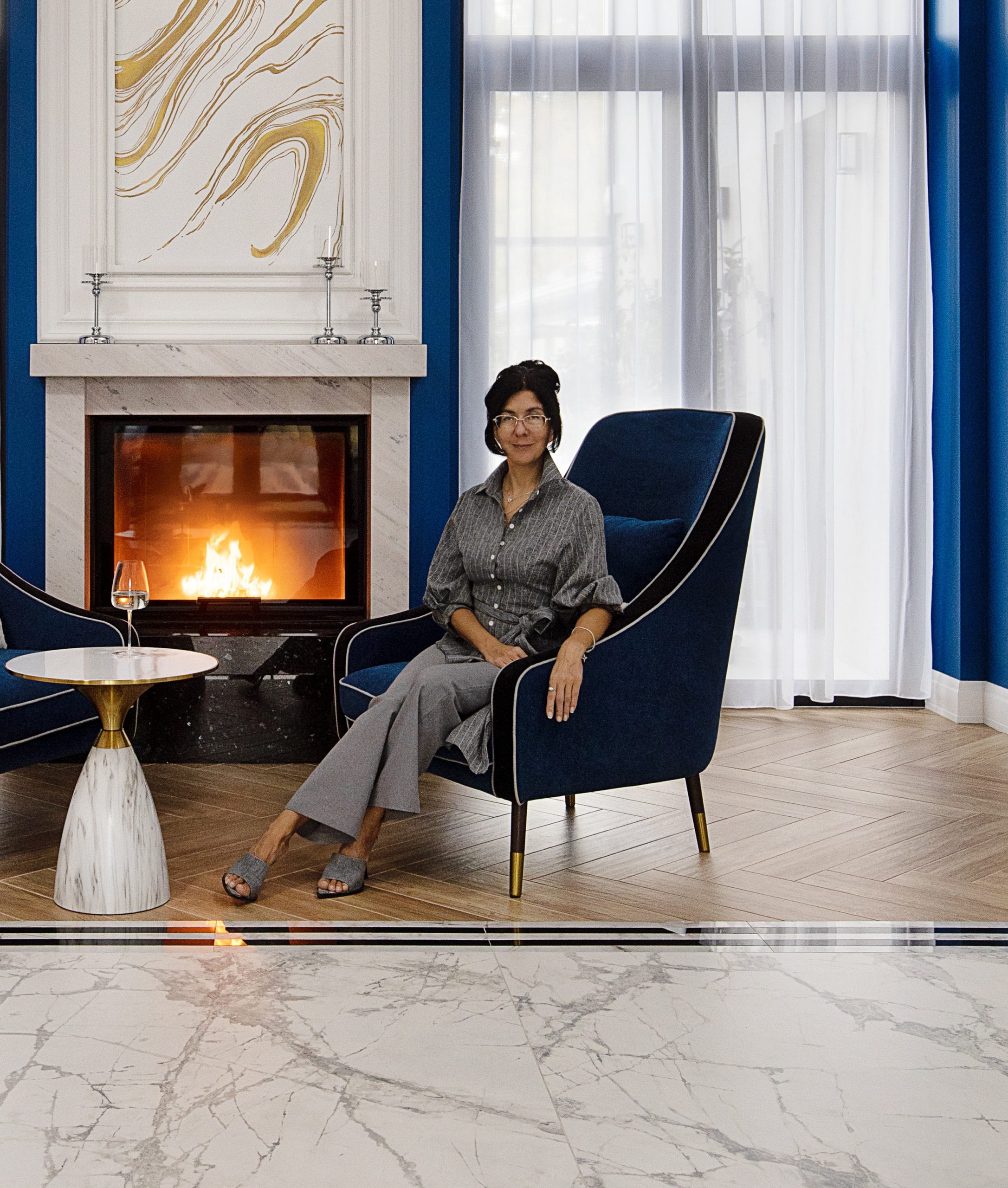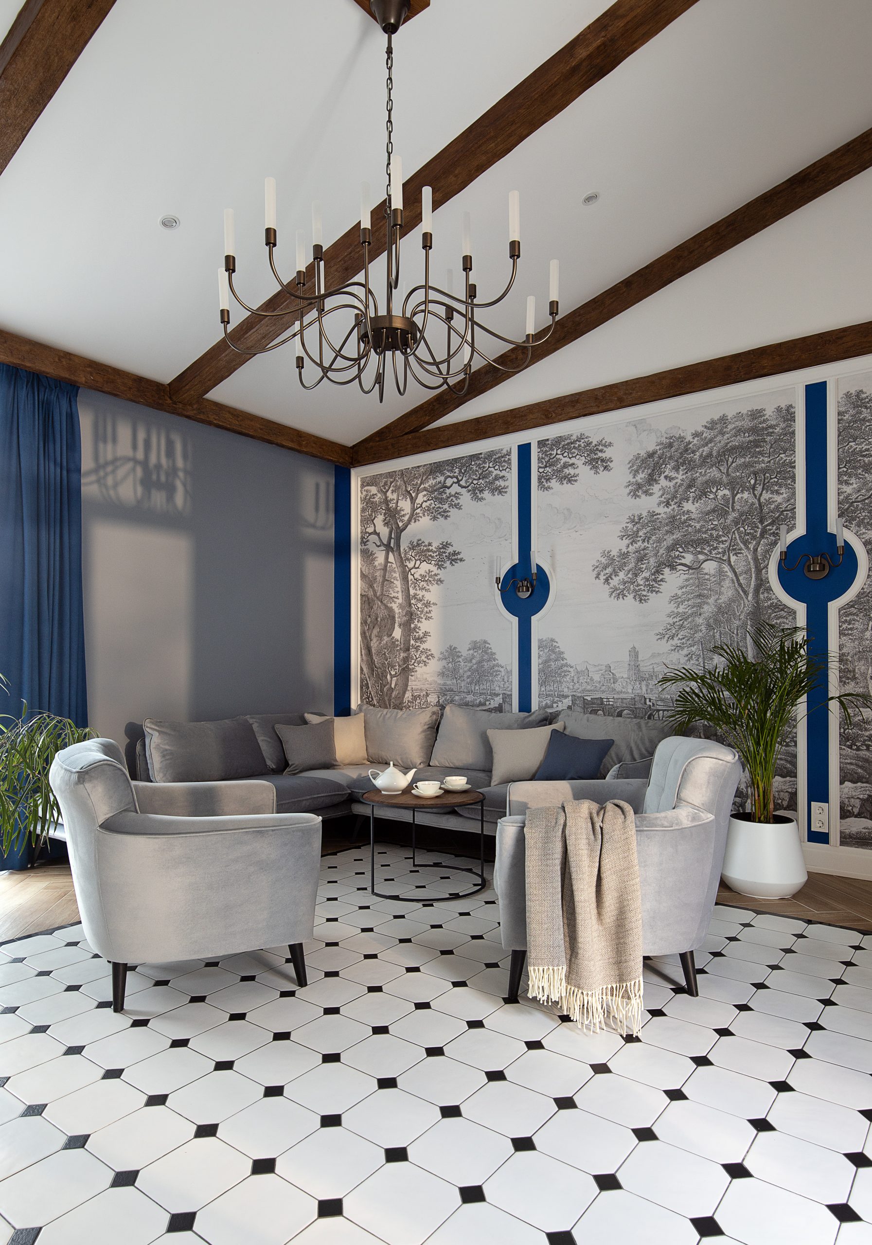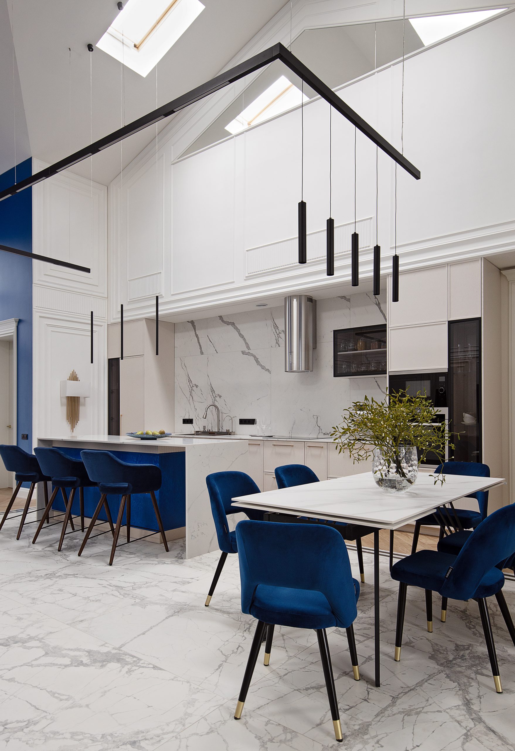 Дом расположен в зеленом поселке недалеко от Калининграда. От своих соседей он отличается прежде всего архитектурой: в одном уровне, доминирующая центральная часть и два симметричных крыла меньшей высотности, большие окна. Не менее интересна планировка: кухня-гостиная — сердце дома, из которой ведут двери во все остальные жилые помещения: спальни, детскую, кабинет, а также в оранжерею и баню. — Архитектура — не только фишка этого проекта, но в определенной мере и проблема, — рассказывает дизайнер Асия Орлова. — Центральная часть дома, где расположена кухня-гостиная, имеет очень большую высоту (около шести метров), которая поначалу вызывала эффект колодца. Оконные проемы в стенах выходят не на улицу, а в соседние помещения — оранжерею и холл, уменьшая инсоляцию. Моя задача была с помощью дизайнерских приемов «заполнить» естественным светом пространство и сделать его по восприятию соразмерным человеку. Я предложила взять за основу два цвета: белый и синий, они придают помещению легкость и спокойствие и очень подходят владельцам дома — цельным, интеллектуальным молодым людям. Белый выбрали двух оттенков: чистый на потолке и над дверями и молочный на уровне глаз, так интерьер кажется солнечным даже в плохую погоду. За счет высоты сводов и лепного декора современное по стилю пространство смотрится «дворцовым». Мы решили не отказываться от этого эффекта — украсили каминный портал акцентной росписью ручной работы, уложили «ковром» керамогранит с эффектом мрамора.