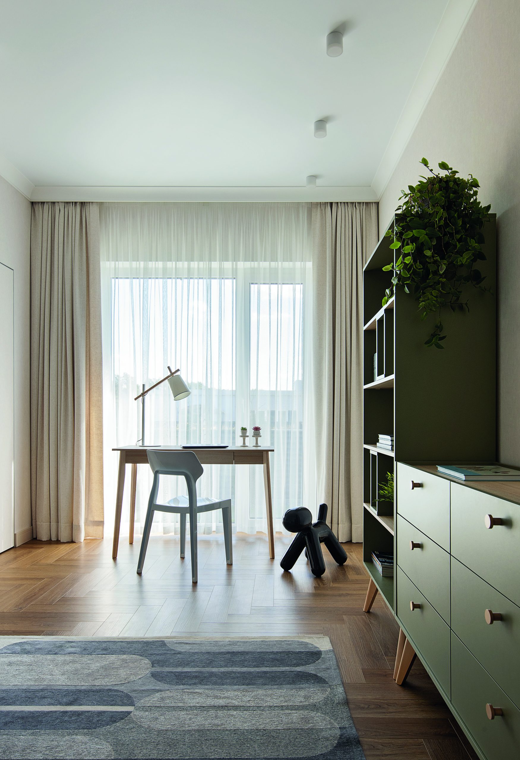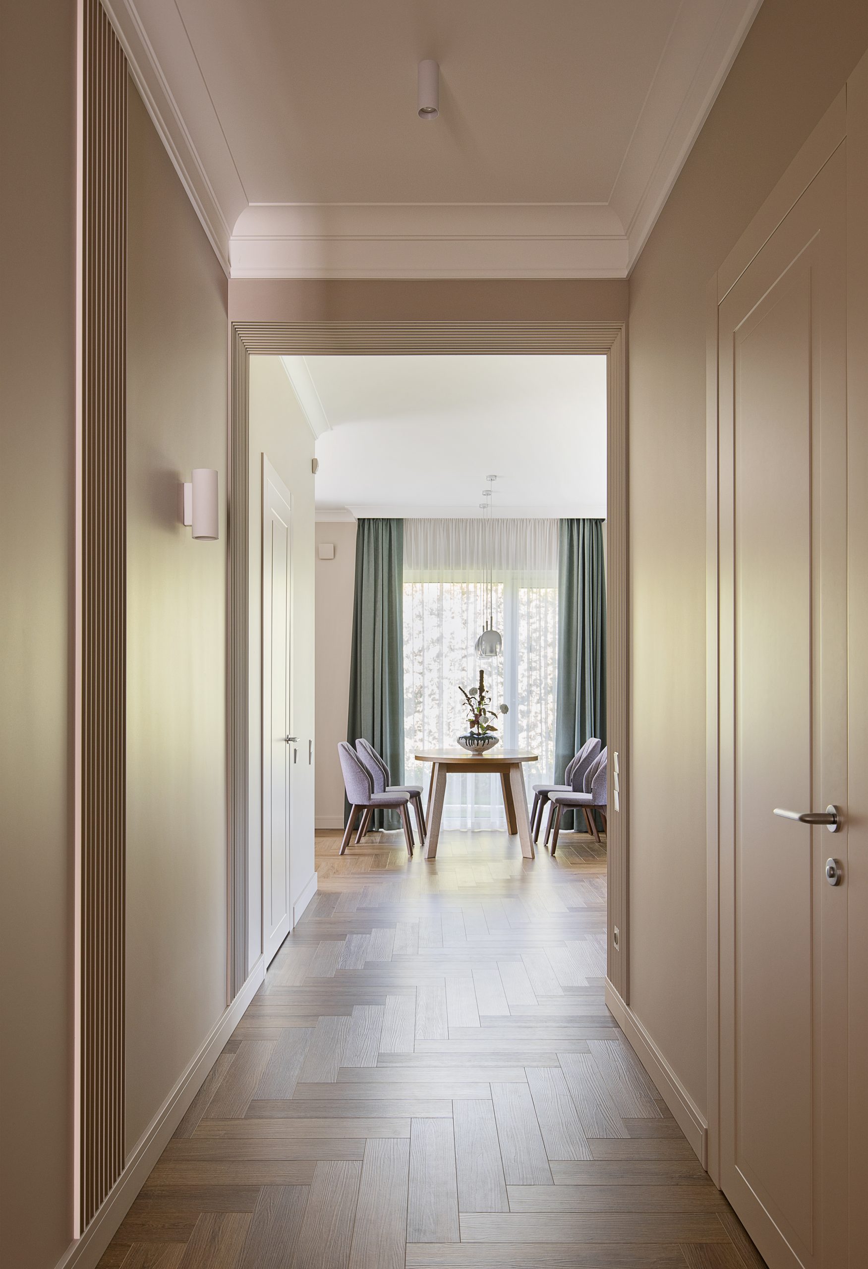 Особенность планировки дома — длинный коридор, из которого ведут двери в жилые комнаты. Чтобы уйти от монотонности, дизайнер использовала для отделки стен декоративные панели под покраску. Вкупе со светильниками они задали ритм пространству. SPC-ламинат, уложенный елочкой, работает на ту же задачу — сделать достаточно простое помещение более декоративным.