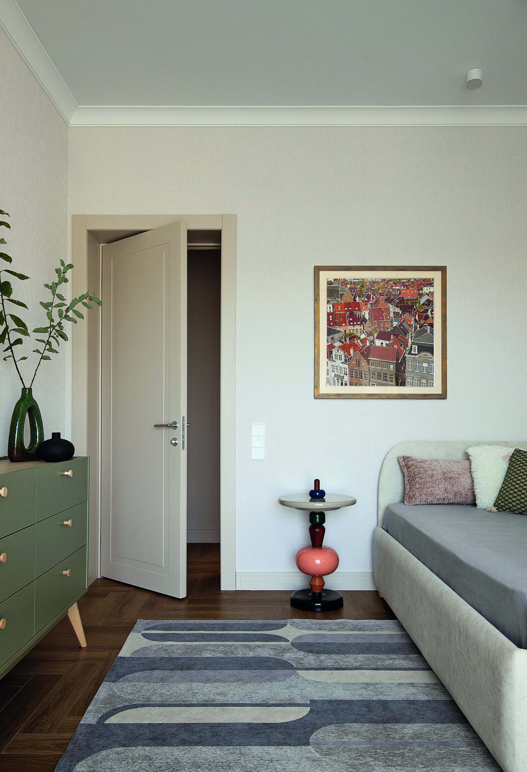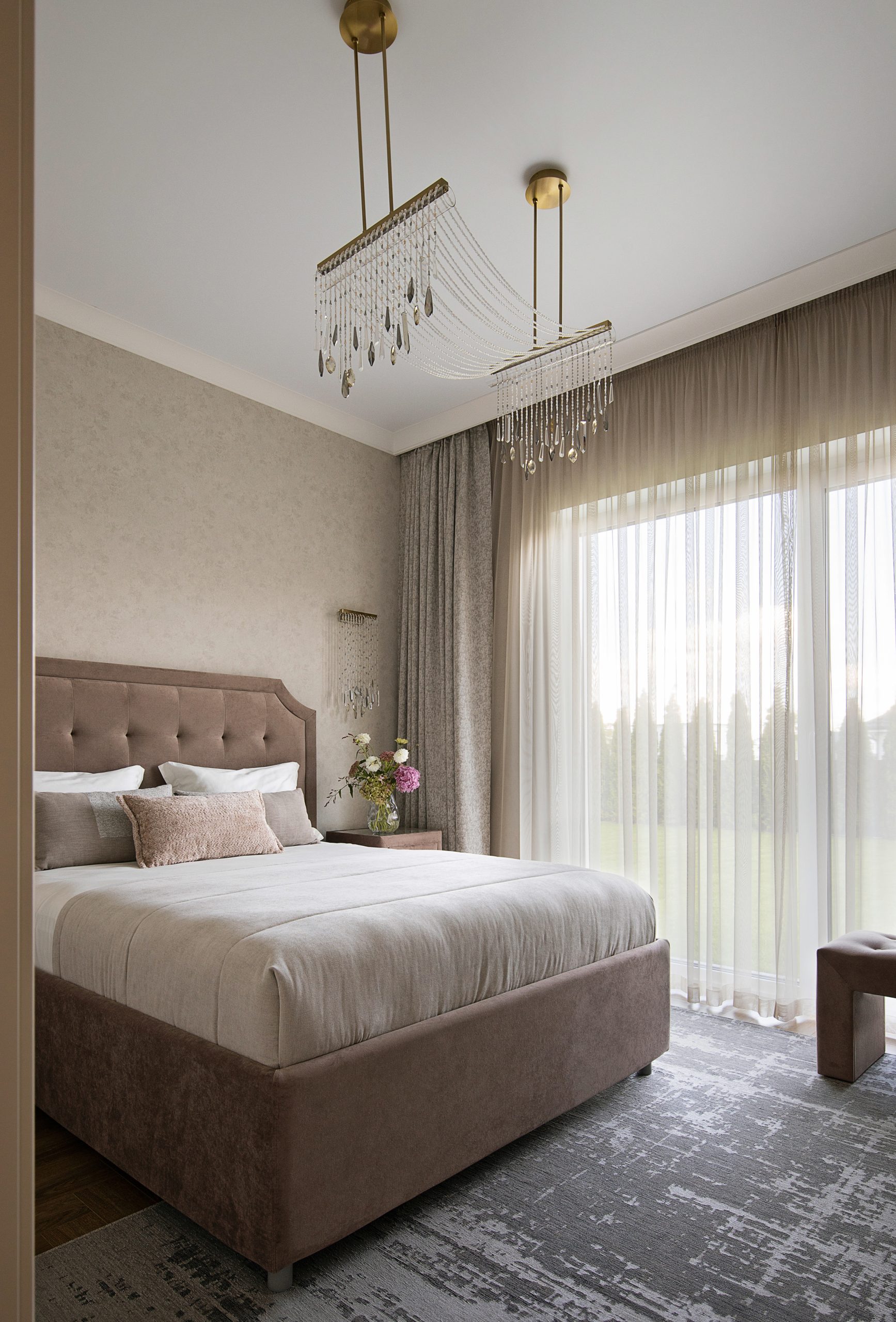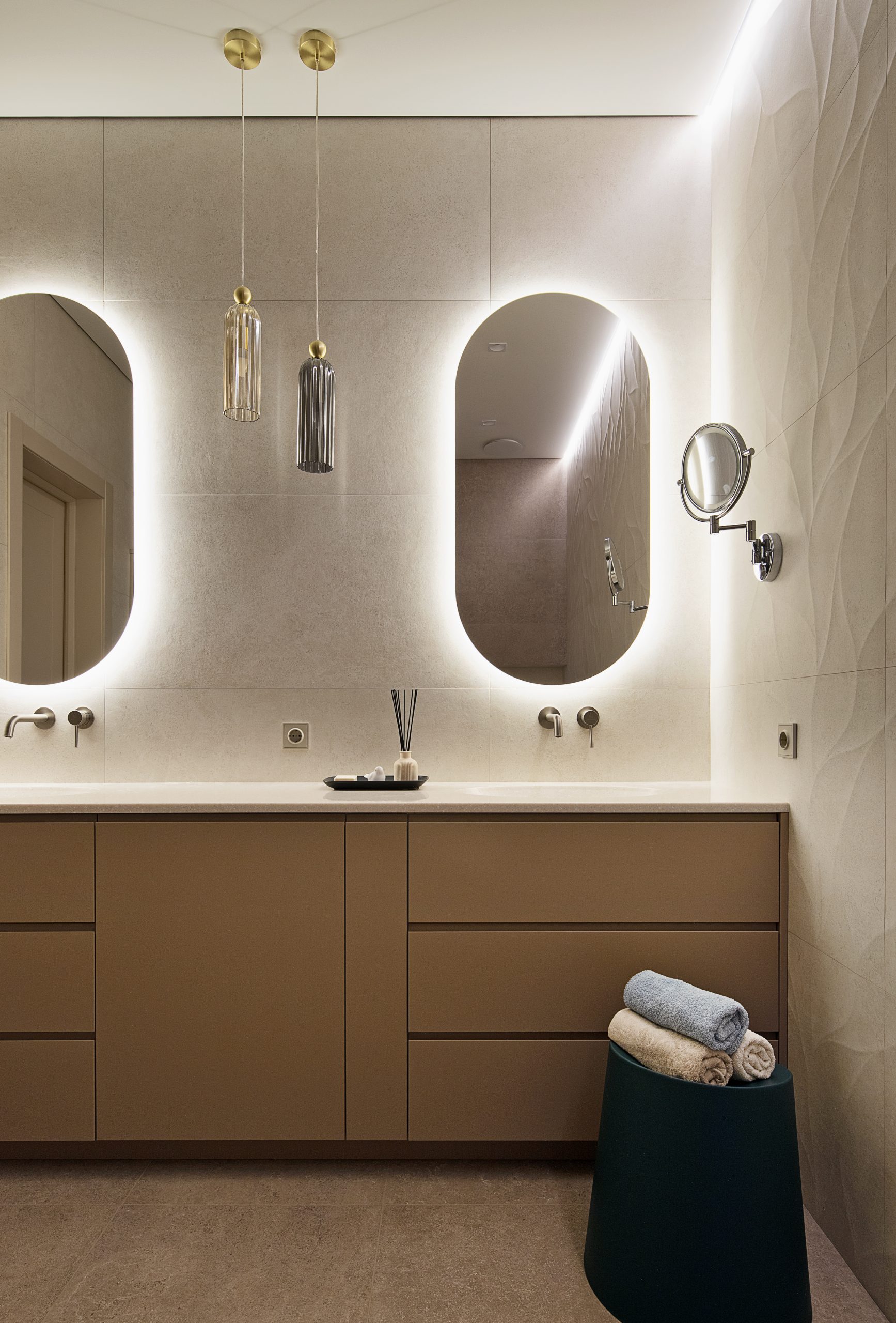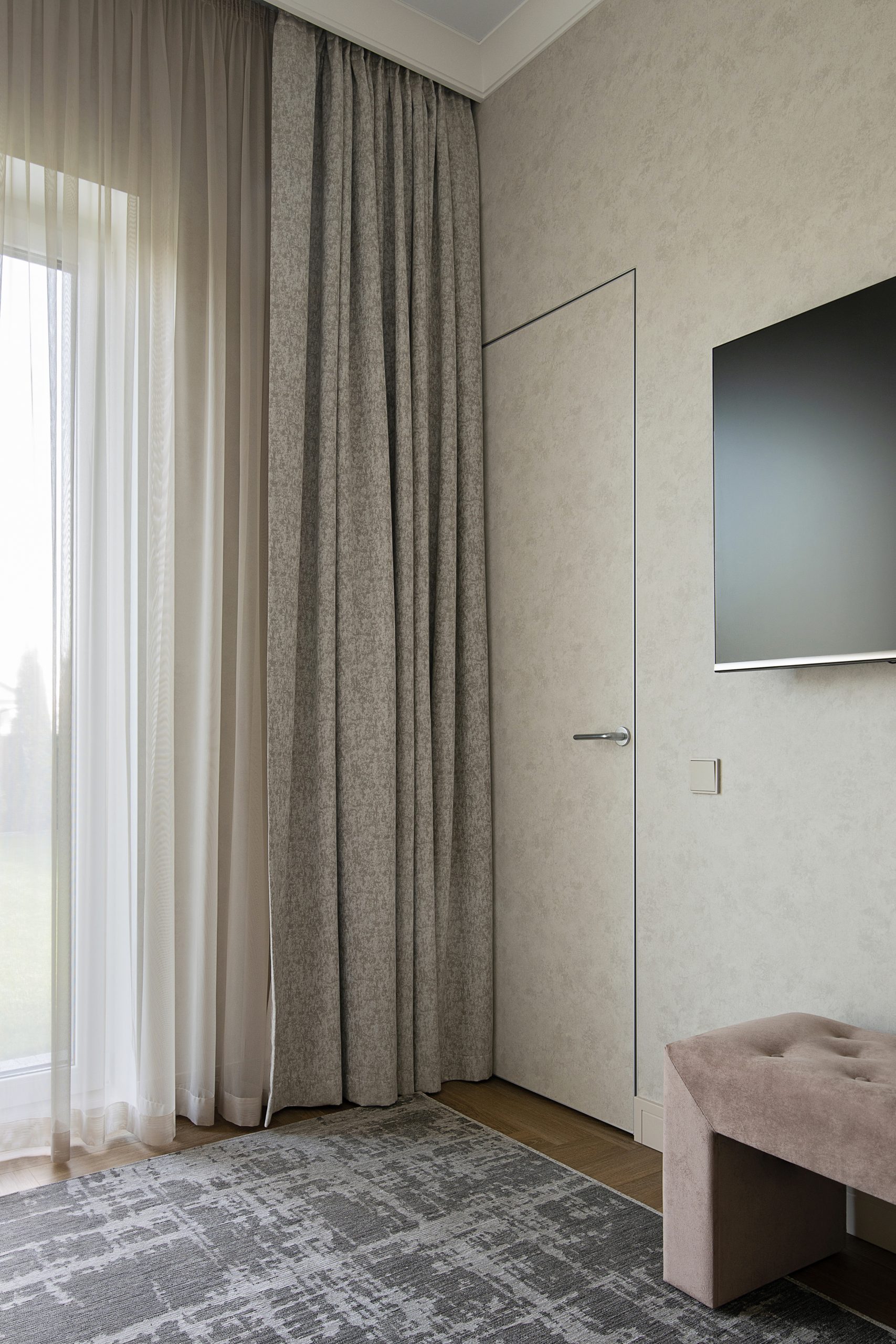 В доме две спальни — хозяйская и дочери-студентки. Во всех имеются вместительные гардеробные комнаты, поэтому продумывать системы хранения не было необходимости, в условно «детской» лишь предусмотрели стеллаж для книг и комод. Входы в гардеробные сделали максимально незаметными, использовав двери скрытого монтажа в алюминиевых профилях, полотна которых оклеили обоями. В доме большие панорамные окна. От солнечного света помещения защищают шторы-блэкауты на карнизах с электроприводом. В вечернее время атмосфера в комнатах становится уютнее благодаря скрытой подсветке карнизных ниш. Хозяева видели свой дом максимально светлым, в этой колористической концепции оформлен весь интерьер. В ванной комнате создали релаксирующую атмосферу, использовав плитку под песчаник. На одной из стен применили керамику с объемным декором, чтобы не менять палитру, но сделать пространство более интересным.
