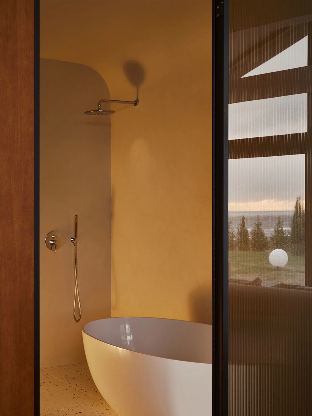 Тема янтаря нашла свое развитие и в номерах. Специально для Tesera в местной мастерской изготовили плитку и раковины из бетона по технологии терраццо, с вкраплениями настоящего янтаря. Более того, во всех кухнях расположили светильники, выполненные мастерской Repin Glass по технологии фьюзинг из переработанных винных бутылок. Теплый свет, проходящий сквозь стекло, заливает свечением всю комнату и подчеркивает сложную структуру светильника, создавая эффект большого куска янтаря. Спа-комплекс полностью ориентирован на панораму побережья, поэтому сердцем проекта стали видовые зоны с огромными окнами, которые превращают каждый сеанс в диалог с природой. Особенно впечатляющие панорамы открываются из инфинити-бассейна, подогреваемого до 33−35 градусов в холодное время года. Спа также включает просторный хаммам, чашу с постоянной подачей снега, открытые душевые. Максимально расслабиться после банных процедур можно на удобных шезлонгах.