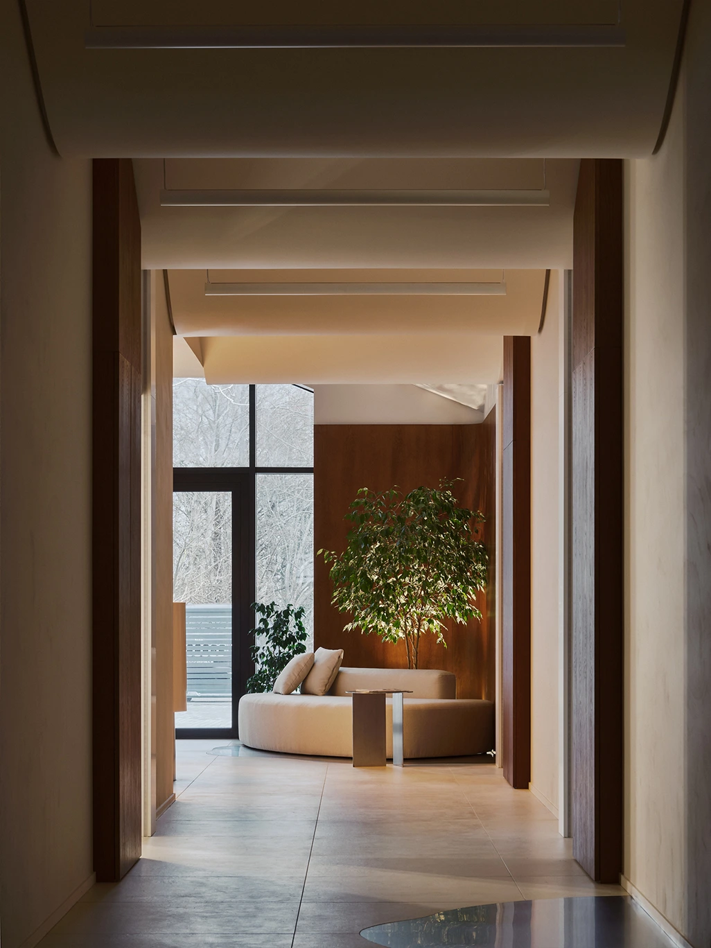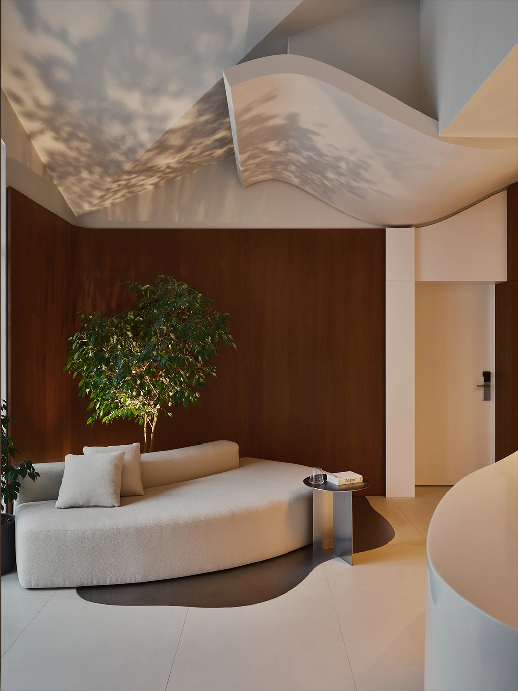 Отель Tesera расположен в поселке Янтарном на первой линии у моря. Из окон открываются потрясающие виды, и эта локация во многом повлияла на дизайн. — Работая над этим проектом, мы хотели сотворить ощущение не просто отдыха, а буквально медитации, — рассказывают дизайнеры студии Line Design. — Мы создали пространство, где человек растворяется в пейзаже, а граница между интерьером и морем становится незримой. Природа здесь главный лейтмотив: море, дюны, янтарь (на Балтике его трудно обойти вниманием), но Line Design для всех этих паттернов нашли новое прочтение. Первое, куда попадают гости, это ресепшен, где внимание на себя обращает трехмерный потолок — его форма напоминает песчаную дюну и интуитивно направляет к коридору, ведущему к номерам. Стойка администратора своими плавными очертаниями тоже похожа на природный массив из песка, а занавесь с мягкими складками ассоциируется с волнами. Самый зрелищный элемент в зоне ресепшена, созданный по чертежам дизайнеров, это светильник. Он представляет собой сложный объем, врезанный в потолок, закрытый 50-килограммовым куском стекла, по цвету и фактуре напоминающим янтарь.