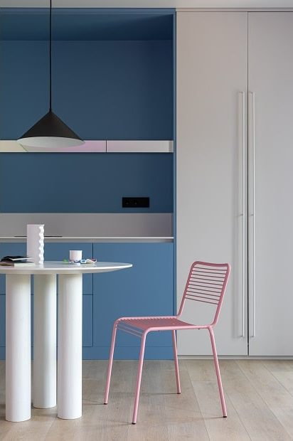 Коммерческое назначение недвижимости мотивировало выжать максимум из однушки площадью 40 кв. м. В квартире сделали перепланировку: объединили кухню с гостиной, выделив спальное место. Кровать на подиуме обособили от остального пространства плотной светонепроницаемой темно-синей портьерой. «Морские» оттенки акцентно использованы во всей квартире.