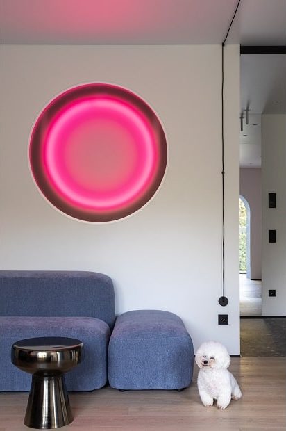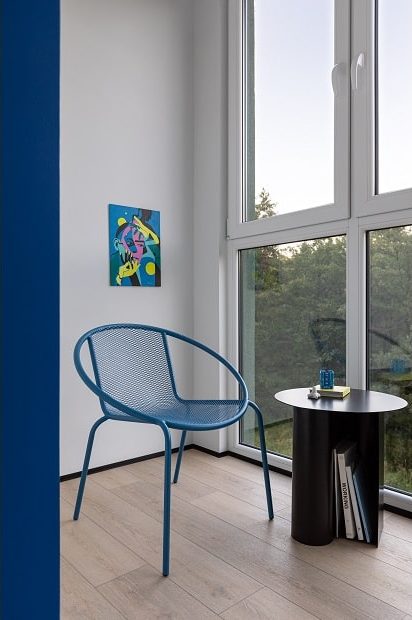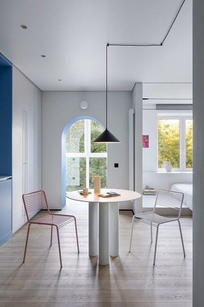 Эта квартира в Зеленоградске — один из нескольких объектов недвижимости, которыми владеет семейная пара. Хозяева планировали сдавать жилье отпускникам летом, а зимой проводить там выходные сами. К Валерии Букиной обратились за яркими и нестандартными решениями, которые бы выделяли предложение на ресурсах аренды. — Несмотря на то, что квартира однокомнатная, мне сразу стал очевиден ее большой потенциал, — рассказывает автор проекта. — Среди бонусов жилья: комнаты правильной геометрии, большая ванная, удачно расположенные коммуникации и, главное, вид из окна на лес, что всегда добавляет уюта. В интерьере много прямых углов, прямых линий, которые хотелось смягчить. Так родилась идея круглого окна между ванной и гостиной. Это уже само по себе смотрится необычно, вдобавок мы сделали в ванной круглое зеркало, разместив за ним диодную RGBW-ленту. Цветной свет через окно заливает всю гостиную. В темное время суток помещение преображается до неузнаваемости. Мебель для арендной квартиры выбрали бюджетную, но стильную. Стол и стулья нашли на маркетплейсе, а диван округлых форм — у российского бренда divan.ru.